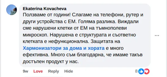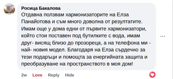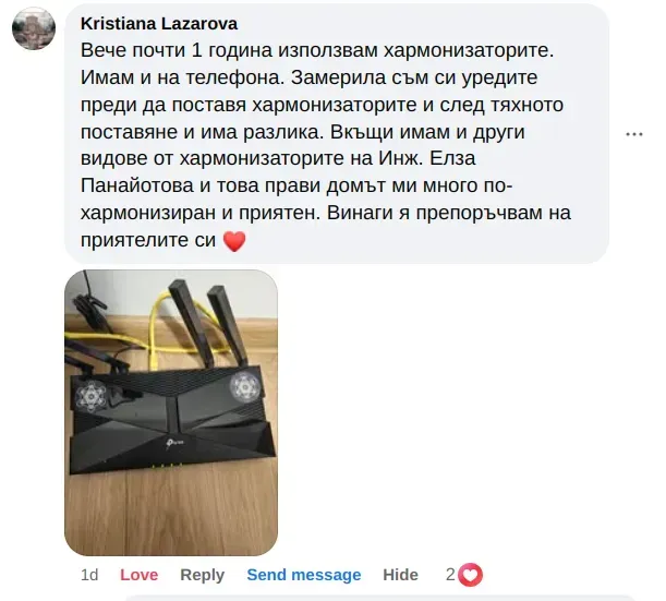 Всички те се произвеждат в България. В разработките участват приятели радиестезисти и ясноусещащи хора, които проверяват независимо от мен и един от друг, кое работи, как може да се подобри и т.н. Съчетавам Фън Шуй, енергийно пречистване на хора и пространства, работа по повишаване осъзнавания на хората и използване на Хармонизатори за да помагам на желаещите да подобрят живота си. Ние имаме право на по-щастлив и лек живот!